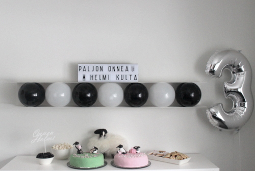 Vietimme sunnuntaina 26.11. 2017 ihanat 3v syntymäpäiväjuhlat. ♡ Teemana oli yksi Helmin suosikeista: Late Lammas. Helmin tätsy teki perinteisesti Helmin juhliin upeat kakut. Pekka leipoi pizzaa ja lisäksi oli tarjolla pientä naposteltavaa. Helmillä oli ihana päivä, hän nautti saamastaan huomiosta, oli mukavaa saada rakkaita kylään ja hän ihasteli kaikkia kivoja lahjojaan. Kynttilöiden puhaltaminen, herkuttelu ja pikkuserkkujen kanssa leikkiminen olivat päivän kohokohtia.